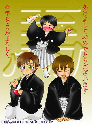 ということで、サイトのメイン人物によるごあいさつです。 これが苦労したのなんのって! だいたい、袴なんて描かないでしょ、普段。 だから何を見ていいんだかわからずに、 とりあえずテレビで見た吉田兄弟(三味線の)を参考に・・・(笑)。