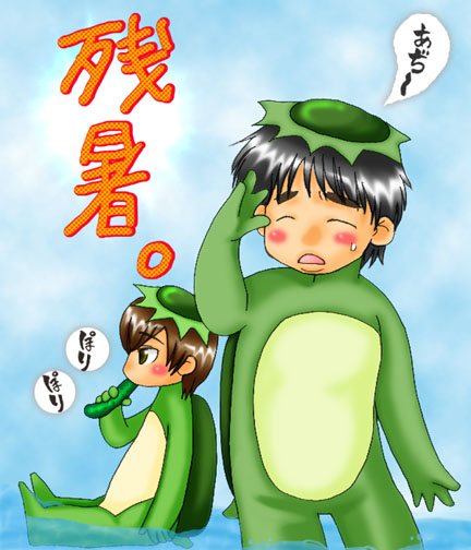 きゅうり食べてる良知カッパと陽射しにグッタリするイノカッパ。 やっぱり着ぐるみって描いてて楽しいです♪