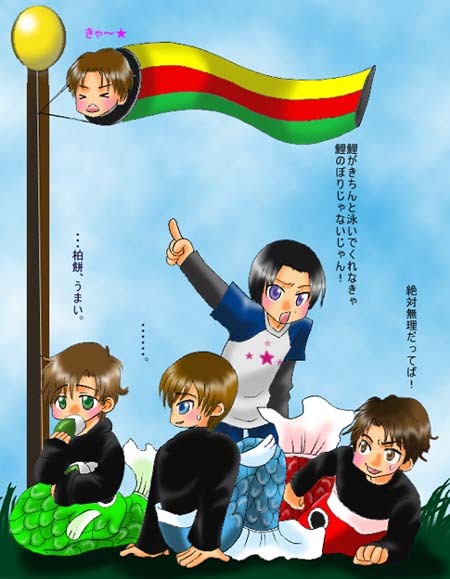 | ゆーみんさんに捧げる『初代MAがじゃれてるところ』・・・じゃれてないじゃん!っていう・・・(−−;;;。  いやはやスミマセン、時期モノにしてしまいました。ケインコスギのCM(カレー)のを思い出してくださるといいんですけど。町田さんの頭の中には、優雅に泳いでいる鯉のぼりがいる予定です(笑)。 なんかまたも食ってますけど>大野。 (縦にも横にも)でかくて見にくいですけど、どうぞもらってやってくださいね>ゆーみん様。ありがとうございました!! ばふ@BLUE☆PASSION管理人 |